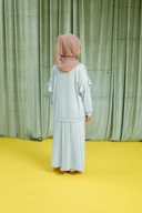 Detail ruffle di bagian lengan menambah kesan manis, sementara rok A-line dengan pinggang full karet memastikan tampilan tetap rapi tanpa membatasi gerak.