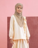 Setelan ini terdiri dari atasan longgar berlengan panjang dengan manset elastis dan bawahan rok celana (kulot) berpotongan flowy, memberikan ruang gerak yang leluasa tanpa mengurangi kesan rapi.