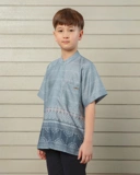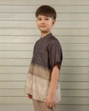 Atasan anak laki-laki lengan pendek dengan kerah shanghai, detail yoke, serta bukaan full hidden button yang memberi tampilan rapi dan modern. Motif print geometris dipadukan dengan aksen kontras di bagian bawah baju, menciptakan kesan clean namun tetap berkarakter. Dilengkapi saku dada fungsional, nyaman dikenakan untuk aktivitas harian hingga acara semi formal.