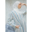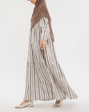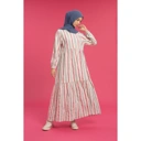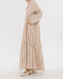 Maxi dress berbahan Premium Linen Crinkle, Motif Vertikal Stripes memberikan efek langsung. Lengan model Bishop dengan ujung lengan karet elastis(Wudhu Friendly) dan 3 Layered ruffles sehingga menciptakan look yang manis saat dipakai.