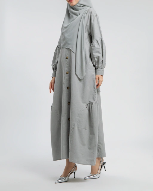 Jadira dress Mom, Gamis dewasa dengan pilihan 2 ukuran. Kerah model Oneck dengan bukaan kancing depan penuh(busui friendly), Lengan bishop dengan kancing di ujung manset(Wudhu friendly), Kantong bagian kanan dan kiri, Serta panel flare yang dipadukan dengan kerut di bagian bawah menciptakan siluet yang flowy dan feminim.