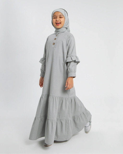 Jadira dress Kids, Gamis anak untuk umur 4-13 tahun. Kerah model Oneck dengan bukaan kancing depan, Lengan bishop dengan kancing di ujung manset(Wudhu friendly), 2 layer dengan kerut memberikan tampilan flowy yang cantik serta keleluasaan bergerak untuk sikecil.
