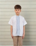 Serene Shirt Kids hadir dengan desain lengan pendek, kerah shanghai, detail yoke, serta full hidden button untuk tampilan rapi dan modern. Dihiasi motif print geometris-monogram dengan aksen geometris kontras pada kerah dan plaket hingga hem, menciptakan kesan clean namun tetap berkarakter. Dilengkapi hidden pocket fungsional