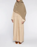 Ananta Dress Mom Dress siluet loose yang jatuh dan anggun, memberikan tampilan modest yang tetap modern. Detail garis dan jahitan dekoratifnya memberi kesan jenjang. Dilengkapi kerah V dengan bukaan half zipper yang rapi dan praktis. Terdapat side pocket serta lengan loose dengan manset lebar, nyaman dipakai seharian.